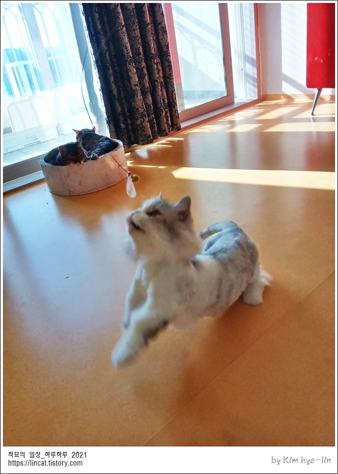 가을 햇살에 눈동자엔 칼을 세우고 바람은 살랑 햇살은 따끈 전형적인 좋은 가을 느낌 채점 방해도 하고 돈 세는 것도 방해하고 놀아달라고 칭얼도 대고 휙휙 잡자 잡자~~~ 투투투툭 휙휙 쭈욱