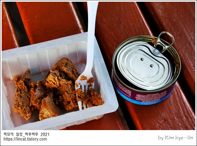 2. 고양이들 다 먹고 난 뒤에 그릇이랑 캔이랑 다 치웠어요.