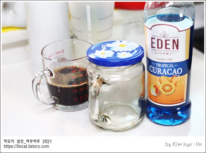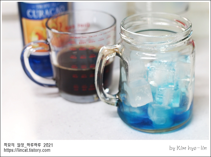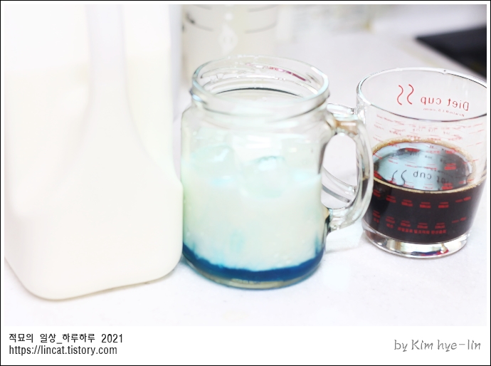 얼음+ 큐라소 시럽 아래 깔고 + 우유 반 넣고 + 에스프레소 올리기