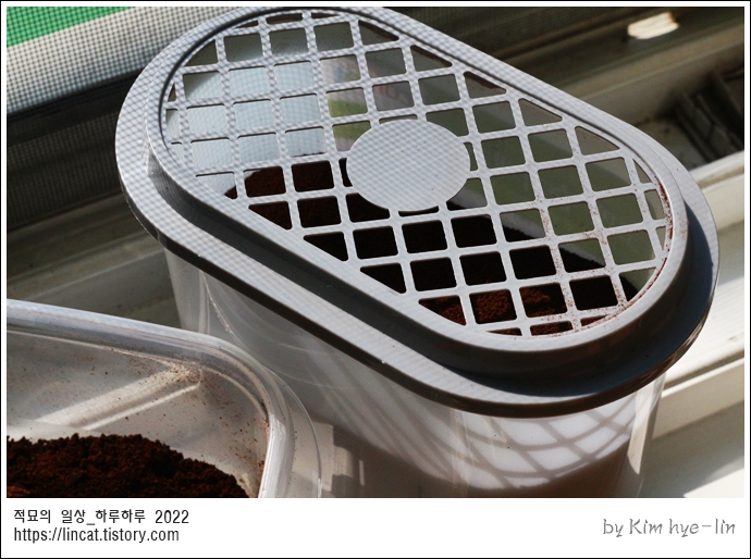 원두 찌꺼기를 솔솔 뿌려주고 있지요.