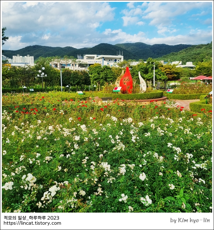 장미를 좋아한다면 늦가을부터 초봄만 빼고 계속 장미가 피는 정관 윗골 공원을 추천하고 싶어요. 기온차에 장미가 채 다 피지 못하고 잎이 상하기도 하지만 그 덕에 또 예쁘게 모양을 오래 잡고 있답니다. 아시죠.. 한여름에 꽃이 순식간에 만개해 버리는데 말이죠. 쉴 수 있는 공간이 많아서 그늘도 많고 평상도 좋고 하늘도 시원합니다. 바로 내려가면 좌광천 산책로랍니다. 색색의 끝물 장미들을 바라보며 유난히 더운 이 가을이 혹시 마지막 시원한 가을이라고 기록될까 무서운.. 요즘 이상 기온 현상에 장미를 볼 수 있다는 것에 그저 감사해야 하는 것이 아닌가 하는 생각도..해봅니다 2021.05.13 - [적묘의 부산]장미정원,정관,구목정공원, 장미원,정관어린이도서관,장미터널,5월의 장미, 장미향기 가득, 미녀와 야..