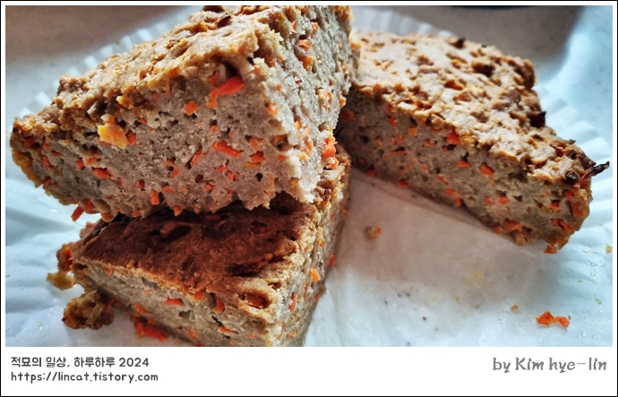 밀가루 160g, 당근 160g, 시나몬가루 조금, 계란 두개 버터나 코코넛오일, 아무 식용 오일도 가능 120g, 베이킹 파우더 4g 소금 조금, 설탕 조금, 달게 먹고 싶으면 120g, 그런데 이건 그냥 올리고당에 찍어 먹는 걸로해서 설탕은 안 넣었어요. 제일 어려운 것은... 당근썰기..ㅡㅡ;; 에 왜 안 잘려욧.. 야채다지기를 못 찾았는데, 그냥 채칼이라도 쓸걸 싶었지만... 최선을 다해서 잘라보았습니다. 코코넛 오일은 그냥 따뜻한 물에 담궈두면 금방 액체가 되서 찰랑찰랑 시나몬가루랑 베이킹 파우더 아..계란이랑 코코넛오일 섞어서 잘 섞어서 가루를 볼에 부어주고 또 잘 섞습니다. 주로 섞네요. 그러면 요렇게 됩니다. 계란 하나 더 할걸.;;; 180도에서 20분, 20분 끊어서 두번 해줬어요. 그..